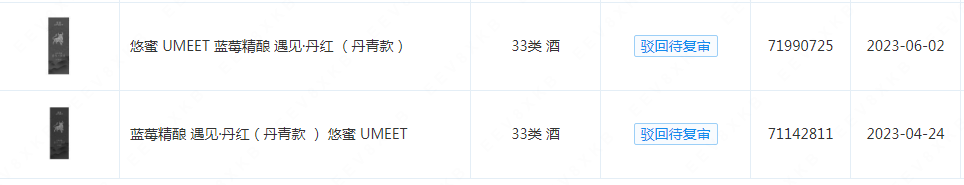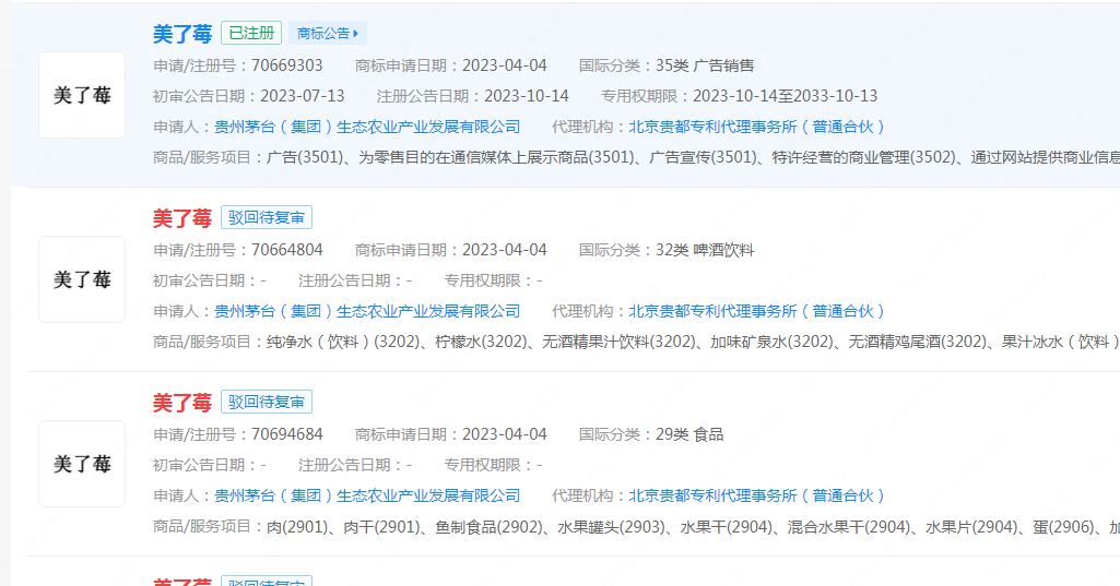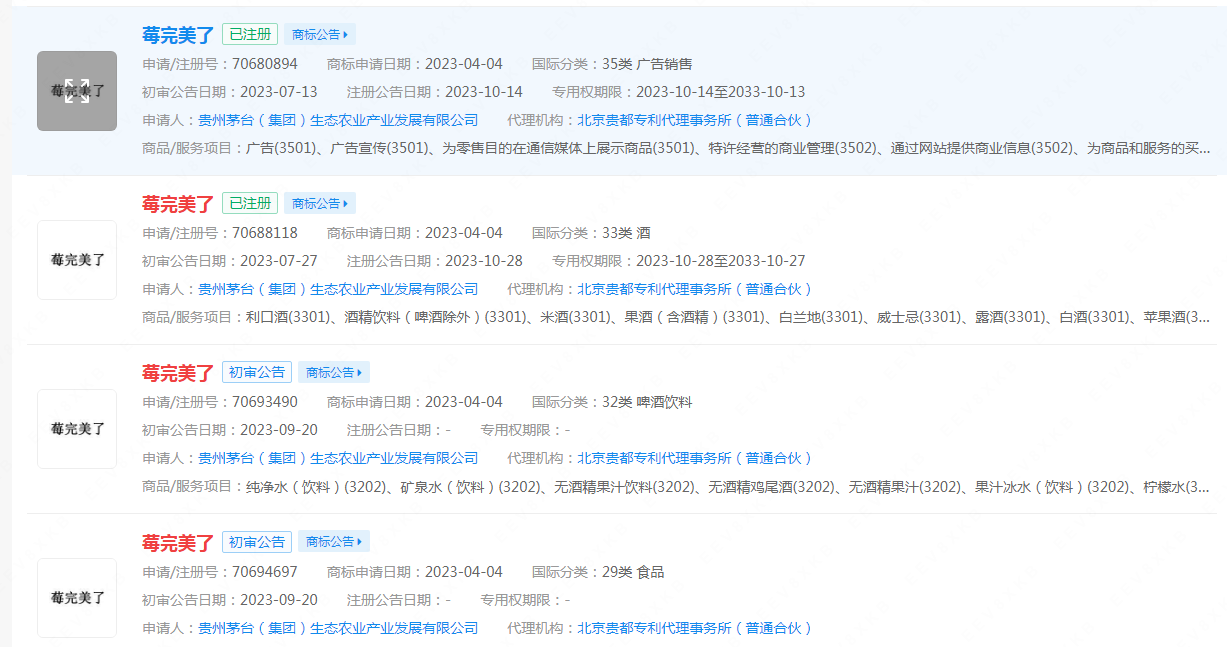 企查查App显示,今年4月,贵州茅台(集团)生态农业产业发展有限公司已申请注册多个“美了莓”“莓完美了”“悠蜜蓝莓精酿遇见·蓝雪UMEET”等商标,国际分类包括酒、啤酒饮料,其中部分商标已完成注册。