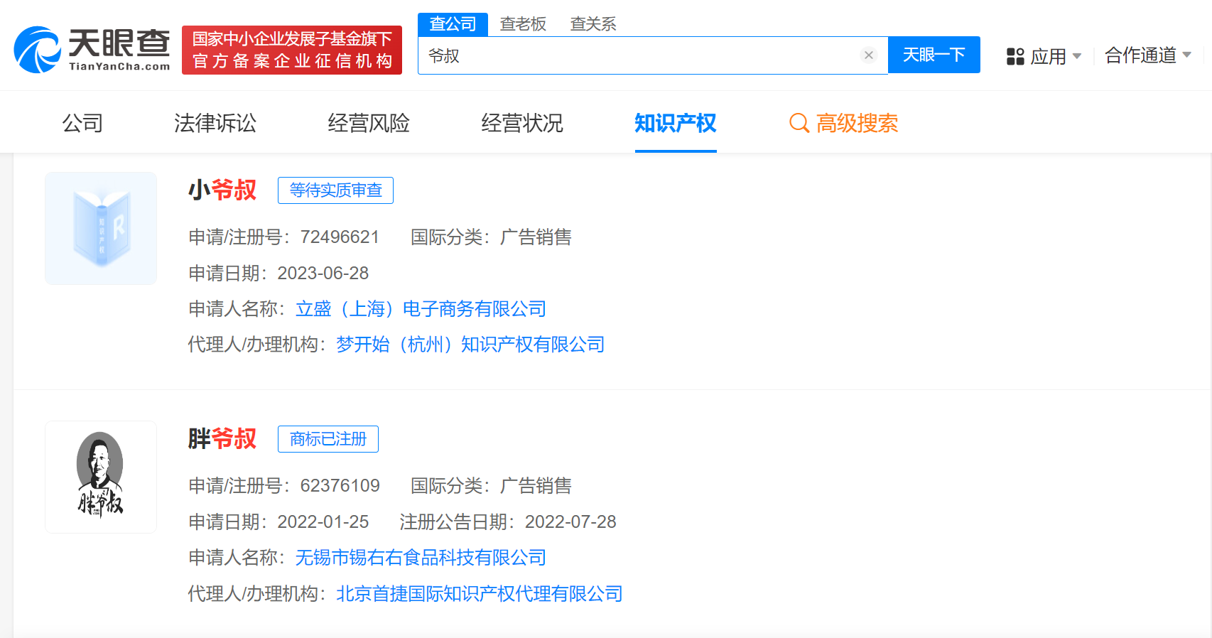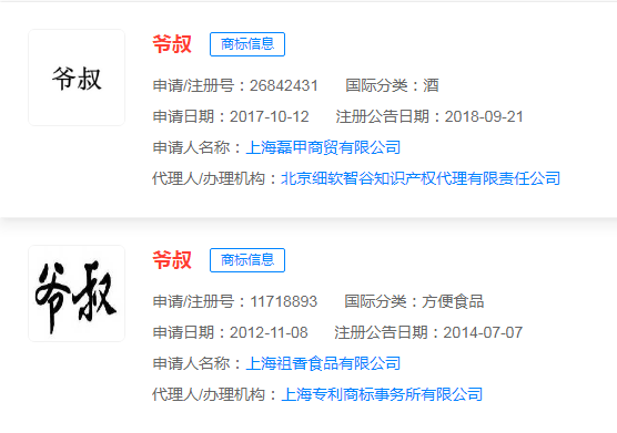 近日,电视剧《繁花》正热播。在剧中,游本昌饰演的“爷叔”成为了阿宝生命中的贵人。爷叔为上海方言,意指叔叔。天眼查App显示,2012年、2017年“爷叔”已被申请注册为商标。此外,“小爷叔”“胖爷叔”“沪上爷叔”等也已被申请注册商标,部分商标已完成注册。